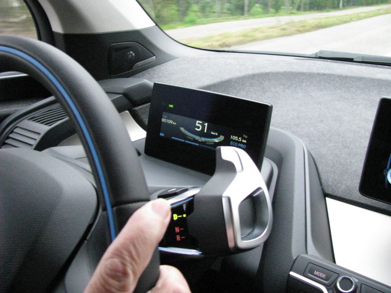 Ein Kupplungspedal hat der i3 sowieso nicht, der Elektromotor treibt direkt die Hinterachse an. Am Lenkrad gibt es einen Wählhebel für Vorwärts (D) , Rückwärts (R), Neutral (N) und einen zusätzlichen Knopf für Parken (P) – kein Getriebe, keine Kupplung.Das kennt man noch so oder so ähnlich von Automatikfahrzeugen.